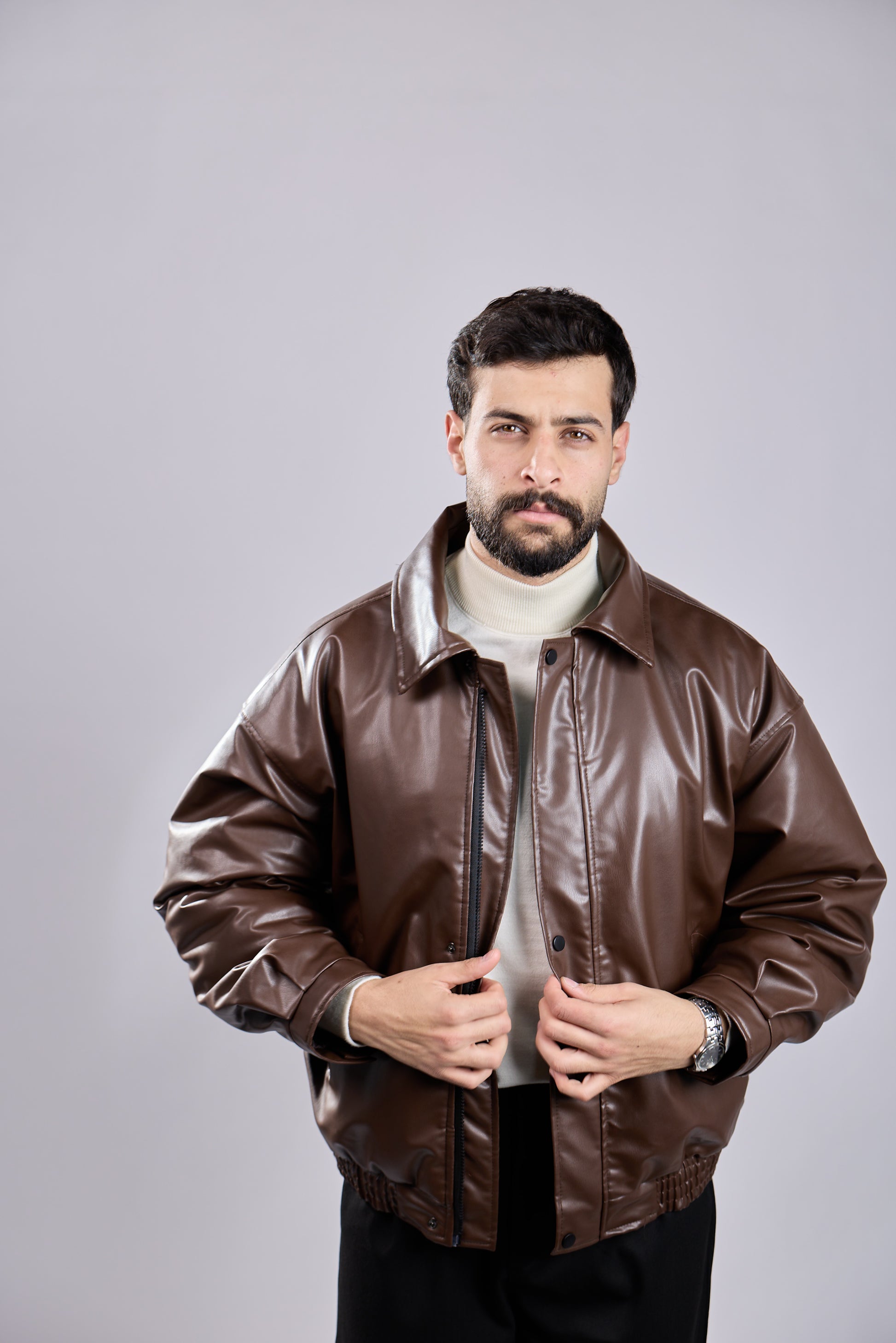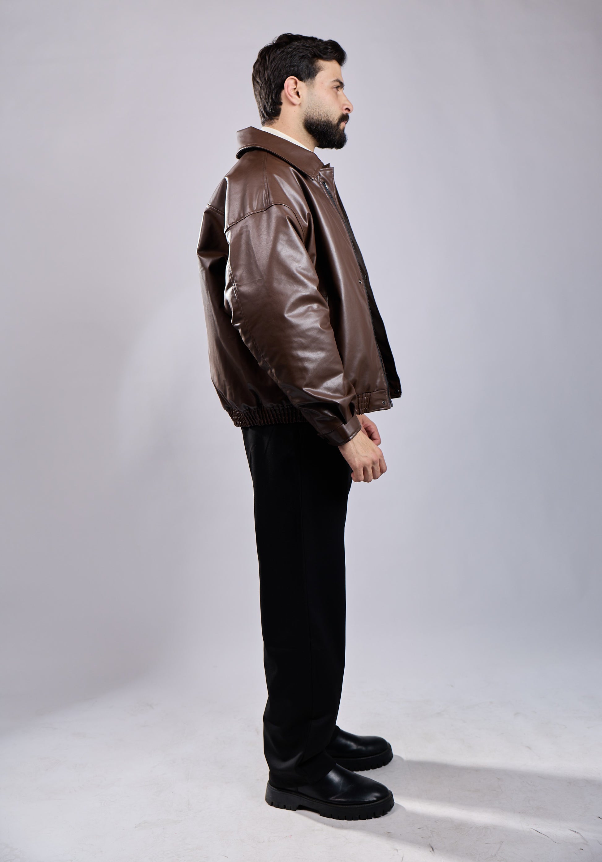 Crafted for a bold and refined look, this brown faux leather jacket brings a modern twist to classic outerwear. Designed with a smooth matte finish, snap-button closure, and relaxed silhouette for effortless layering.