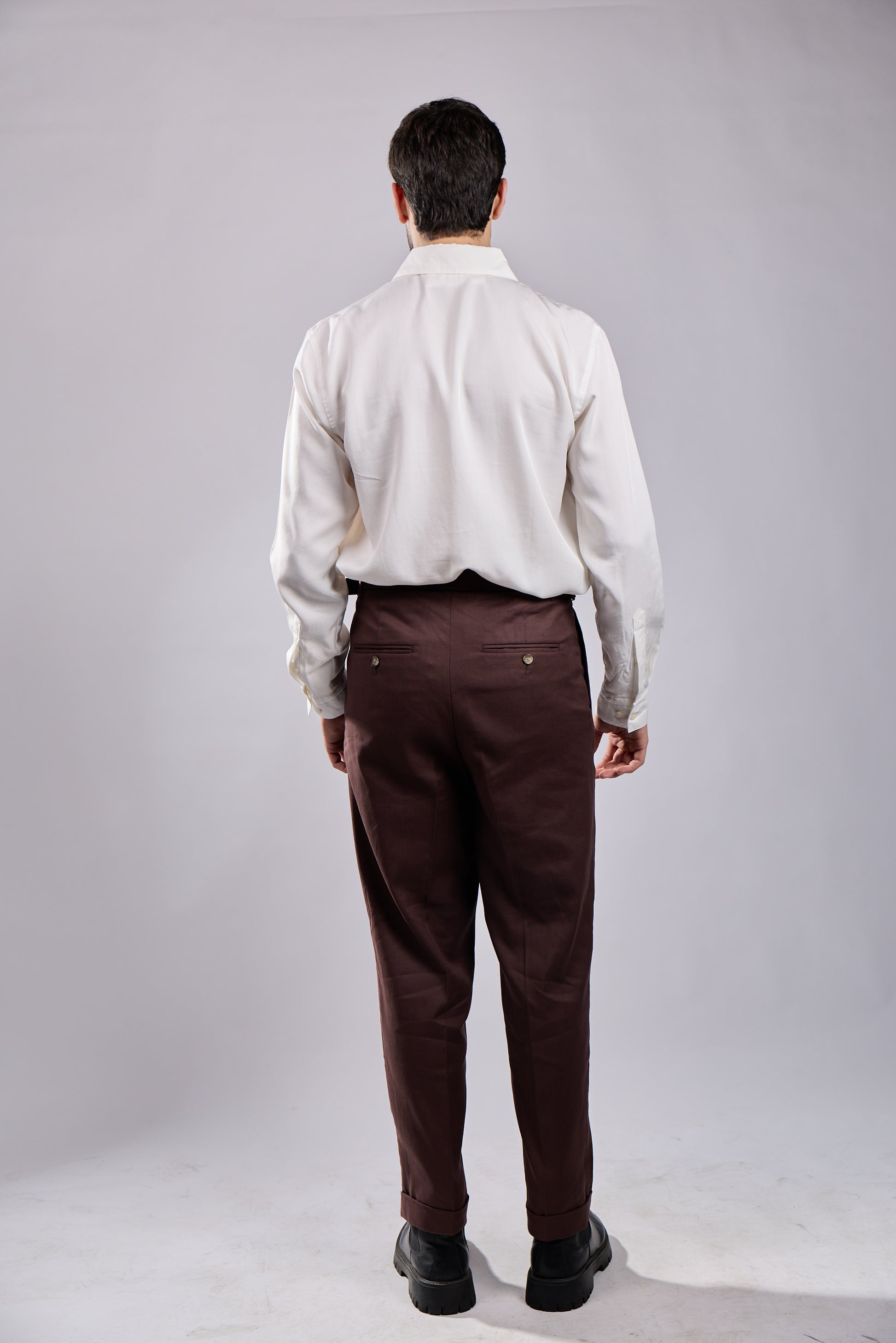 Sophisticated and breathable, these brown trousers combine comfort with timeless elegance. Designed with a tapered fit, front pleats, and cuffed hems for a polished silhouette perfect for both smart-casual and refined everyday wear. Style effortlessly with loafers or a crisp shirt.
