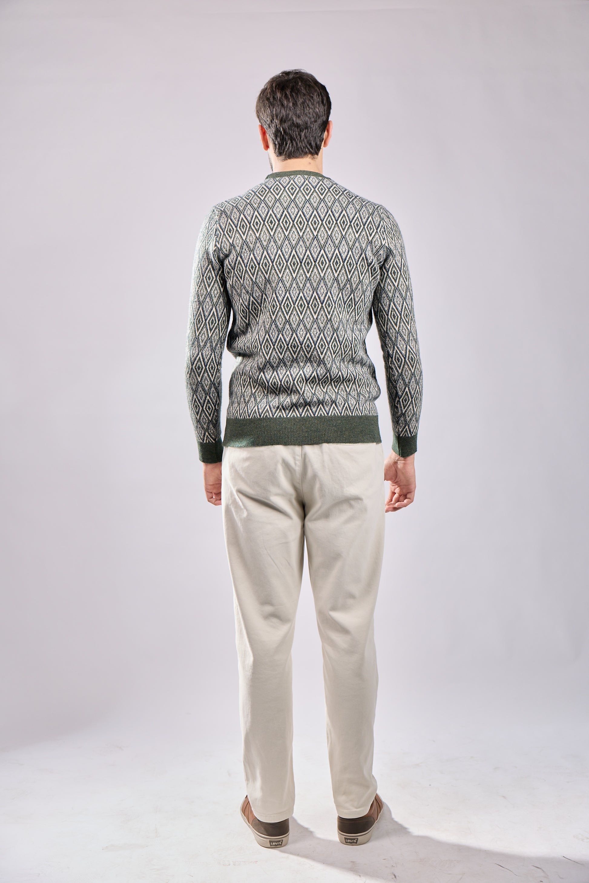 Make a statement with this Men's Geometric Pattern Knit Sweater. Crafted with a detailed diamond/argyle-style pattern, it offers a sophisticated texture and visual interest. The crewneck and solid ribbed trim provide a structured finish, perfect for pairing with jeans or tailored trousers."